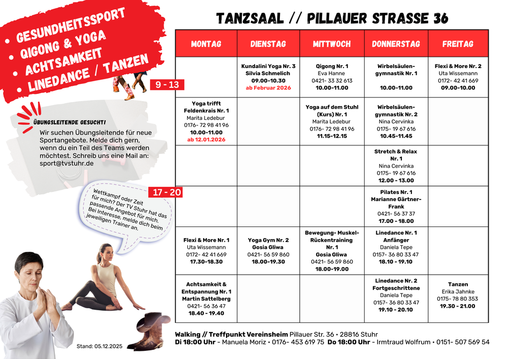 Im September ist unsere Vereins-Website umgezogen und präsentiert sich nun in einem neuen Gewand. Einige Bereiche – insbesondere Reha, Gesundheitssport und Gymnastik – befinden sich derzeit noch im Aufbau. Wir arbeiten mit Hochdruck daran, alle Informationen, Kurszeiten und Ansprechpartner Schritt für Schritt zu ergänzen. Ein regelmäßiger Blick auf die Seite lohnt sich also! Danke für euer Verständnis und eure Geduld.