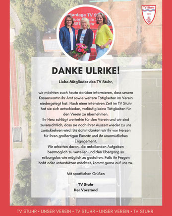 wir möchten Euch heute darüber informieren, daß unsere Kassenwartin ihr Amt sowie weitere Tätigkeiten im Verein niedergelegt hat. Nach einer intensiven Zeit im TV Stuhr hat sie sich entschieden, vorläufig keine Tätigkeiten für den Verein zu übernehmen.