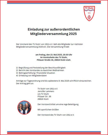 Der Vorstand des TV Stuhr von 1911 e.V. lädt alle Mitglieder zur nächsten Mitgliederversammlung 2025 ein.