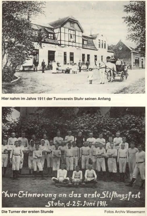 Der TV Stuhr kann stolz auf seinen 100-jährigen Werdegang sein. Wegbereiter waren die 22 Gründungsmitglieder mit ihrem ersten 1. Vorsitzenden Heinrich Thümler, die am 15. 01. 1911 im Lindenhof in Stuhr unseren Turnverein ins Leben gerufen haben. Für sie war Sport noch sehr begrenzt auf Geräteturnen, Freiübungen, Laufen und Springen. Sie wußten nicht, welch schweren Zeiten sie entgegen gehen würden. Zwei Weltkriege standen ihnen bevor, in denen ein Vereinsleben nur sehr eingeschränkt oder gar nicht stattfinden konnte.